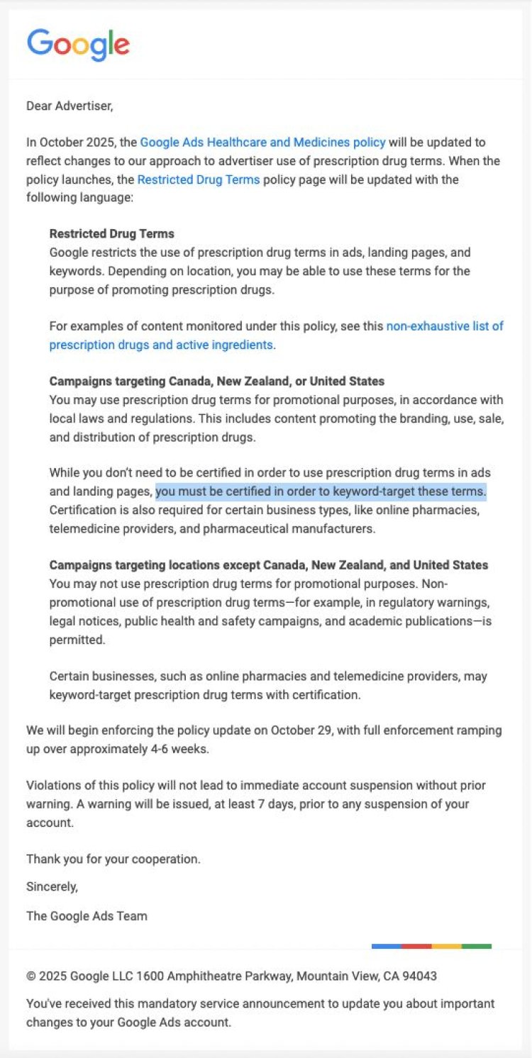 Google Ads introduces a sweeping change- effective October 29, advertisers must obtain certification to target prescription drug keywords, marking a major regulatory shift for healthcare, pharma, and legal marketing industries.